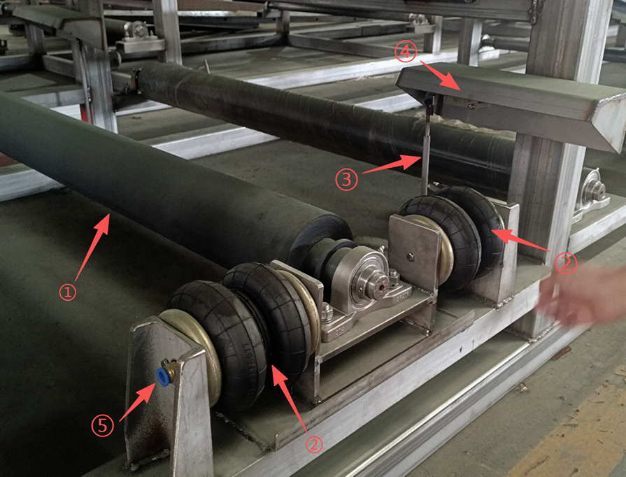 在正常運轉(zhuǎn)中,濾布是不會碰到糾偏裝置的檢測桿。當濾布跑偏時,濾布會碰到檢測桿,檢測桿偏移,自動糾偏裝置中的氣囊會一側(cè)充氣,一側(cè)放氣,帶動糾偏輥蛇形偏移,使濾布改變偏移方向,恢復(fù)到正常運轉(zhuǎn)軌跡。