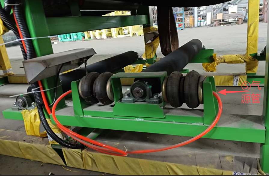 在正常運轉(zhuǎn)中,濾布是不會碰到糾偏裝置的檢測桿。當濾布跑偏時,濾布會碰到檢測桿,檢測桿偏移,自動糾偏裝置中的氣囊會一側(cè)充氣,一側(cè)放氣,帶動糾偏輥蛇形偏移,使濾布改變偏移方向,恢復(fù)到正常運轉(zhuǎn)軌跡。