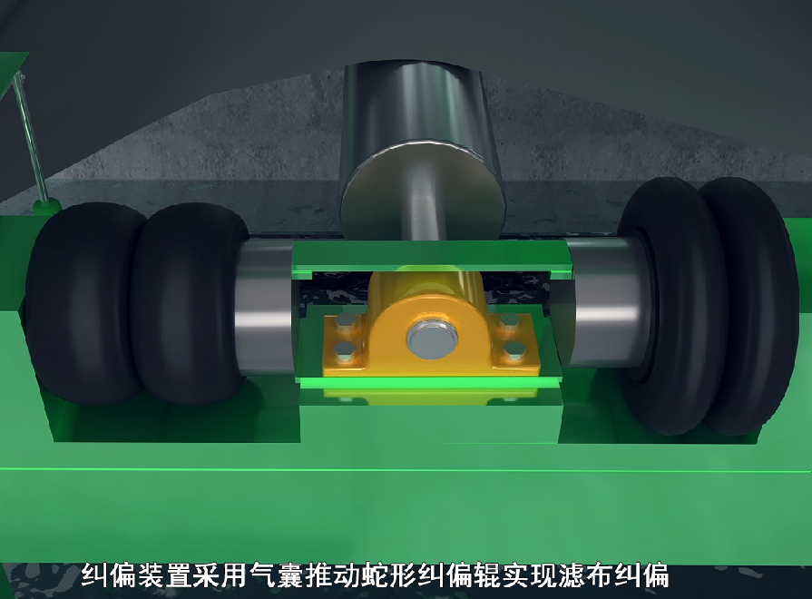 濾布在運轉(zhuǎn)過程中可能會出現(xiàn)跑偏的現(xiàn)象,利用濾布糾偏裝置糾正濾布偏移方向,使濾布處于正常工作狀態(tài)。